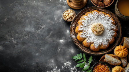 A beautiful arrangement of traditional sweet treats on a rustic table, featuring a variety of pastries and desserts ideal for festive celebrations.