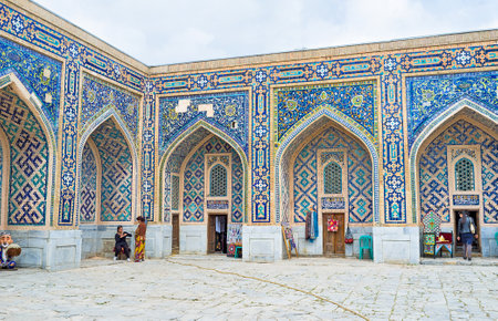 SAMARKAND, UZBEKISTAN - APRIL 30, 2015: Tilya Kori Madrasah courtyard became the popular tourist market with traditional clothes and souvenirs, on April 30 in Samarkand.