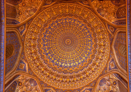 Samarqand, Uzbekistan - June 9, 2019: Ceiling with gold and blue colors of the Tillya-Kori Madrasah in the centre of Samarqand in Uzbekistan.