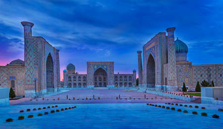 Registan Square at the twilight in Samarkand, Uzbekistan