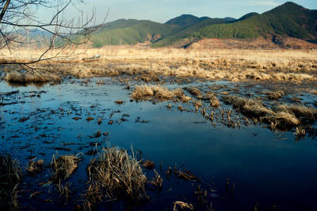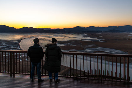 Sunset over the wetland with waterway at Suncheon Bay in South Korea