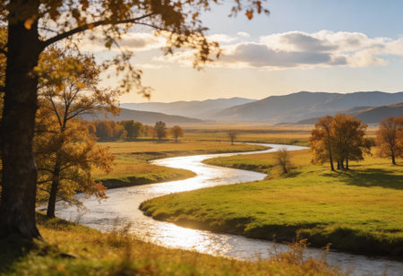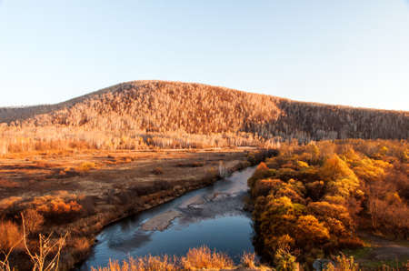 Bend of river in yellow grass. Golden autumn in mountain valley. Snow rocks on horizon