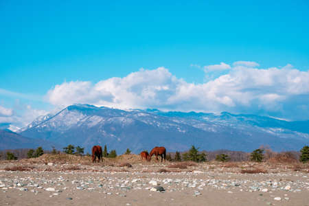 horses graze among the stones against the background of the mountains. the mountains are covered with snow. early spring in the Caucasus