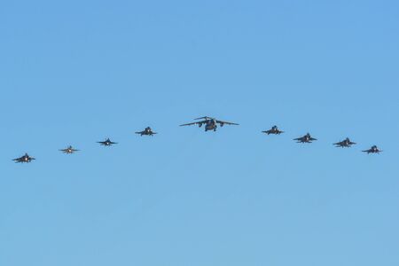 MOSCOW, RUSSIA - MAY 7, 2015: A group of airplane. Rehearsal of parade devoted to May 9, 70-th Victory Day in World War II. May 7, 2015 in Moscow.
