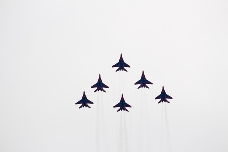 MOSCOW - MAY 9: Mig and Su fighter planes on parade in honor of Great Patriotic War victory ranged in number 65 on May 9, 2010 in Moscow, Russia. This War is portion of WW II from June 22, 1941 to May 9, 1945