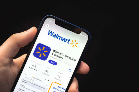 Kharkov, Ukraine - June 4, 2021: Man hold mobile phone with Walmart app