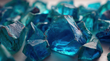 Sky blue glass shards are scattered across a surface, reflecting light and showing details.