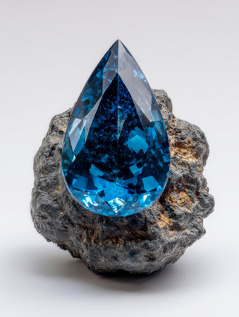 A luminous blue gem with a pear silhouette sparkles brilliantly atop a rugged volcanic stone, highlighting the harmony between raw earth and refined craftsmanship.