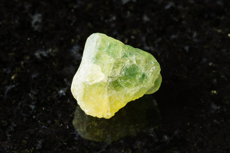 sample of rough yellow green sapphire corundum rock on black granite background close up from Nigeria, Kaduna
