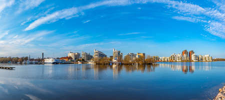 SCHWERIN, GERMANY - June 15, 2021 Ziegelsee with lakeside promenade and apartment buildings