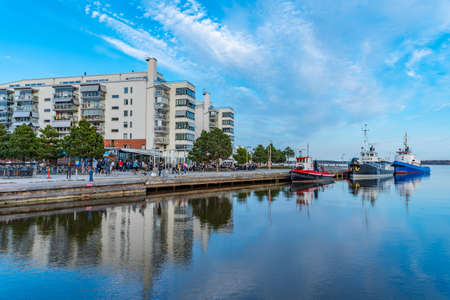 RAUMA, FINLAND - JULY 6, 2013: The modern city center. On the background is Old Rauma, the object of the Unesco World Heritage site. Rauma located in western Finland, on the coast of the Gulf of Bothnia