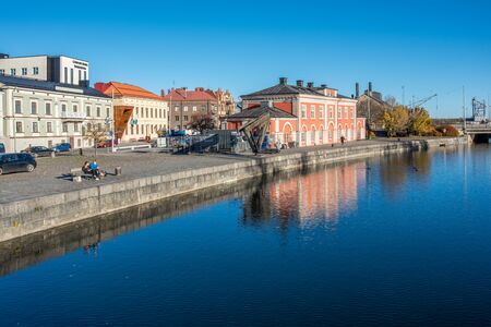 Norrkoping, Sweden - November 3, 2017: Old custom house at Motala Stream in Norrkoping during autumn in Sweden. Norrkoping is a historic industrial town.