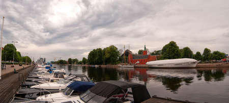 Downtown Umea, Sweden and its river with a cloudy sky.