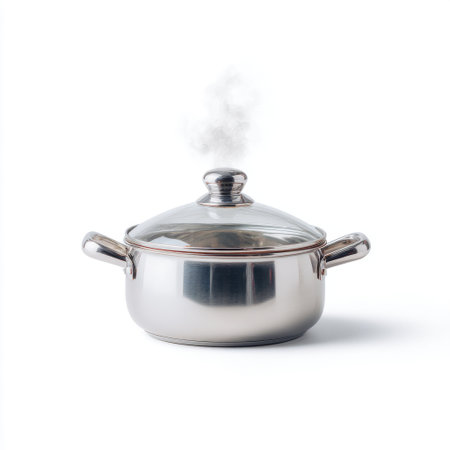 This sleek stainless steel cooking pot features a secure lid and steam rising, making it perfect for various cooking methods in any kitchen.