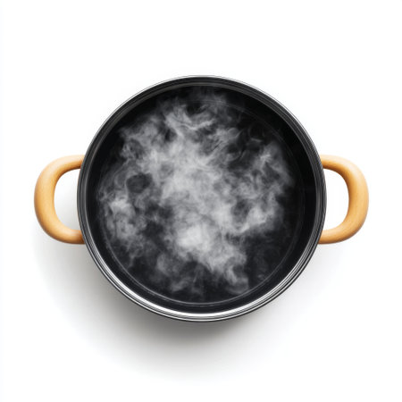 A sleek black cooking pot filled with steam sits against a white background, showcasing the beauty of culinary preparation and modern kitchen design.