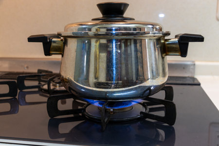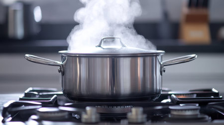A stainless steel pot steam rises on a modern stovetop, symbolizing cooking and warmth. Ideal for culinary themes, meal preparation, and kitchen settings.