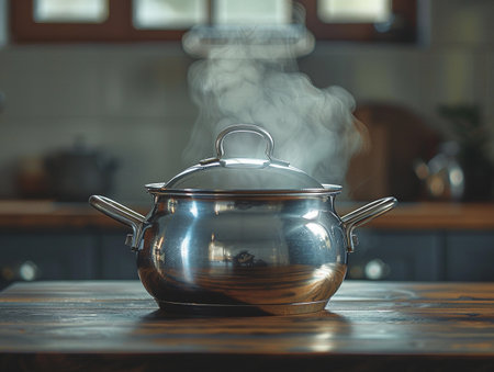 Captivating scene featuring silver pots on a stove, releasing steam in a cozy kitchen. The warm lighting creates an inviting atmosphere perfect for cooking.