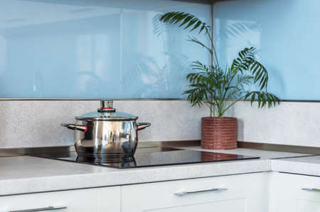 A metal pot on an electric induction cooker in a modern kitchen. Copy space.