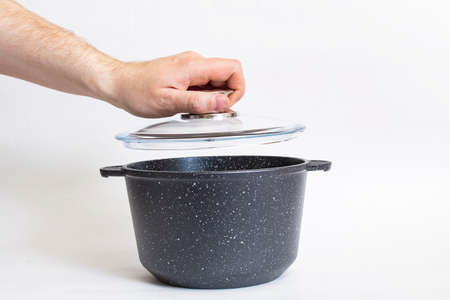 Black saucepan and hand with lid on white background close up