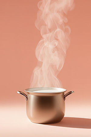 Steaming copper pot with steam on pink background. Copy space.