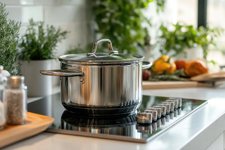 A shiny stainless steel pot with steam rising sits on a modern induction stove, symbolizing home cooking and culinary preparation in a bright kitchen setting.