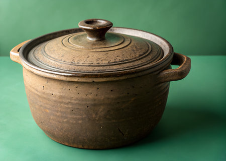 This elegant green cooking pot with a lid sits against a dark green background, perfect for culinary design inspiration and kitchen tool imagery.
