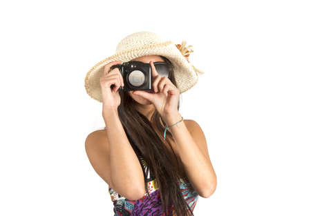 Summer portrait of happy young woman photographer with film camera wearing white straw hat on blue background