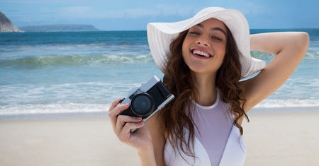 Digital composite of Close up of millennial woman in summer hat with camera against beach