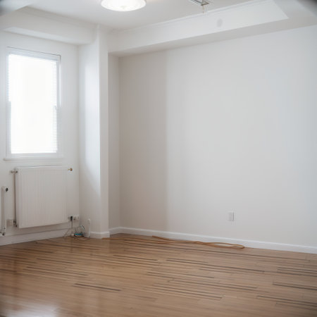 Large, empty room with a white wall and wooden floors. The room is large and open, with a window on the wall. The room is empty and has a clean, minimalist look
