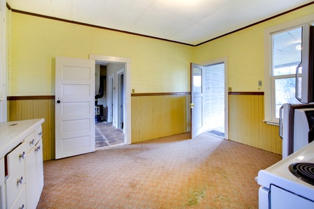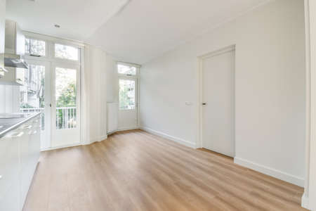 empty corner of a kitchen room with wooden floor ,white walls and a balcony door