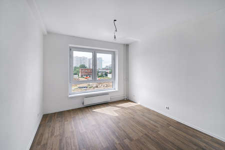 Empty room after repairs in an apartment building. Fresh renovated room with wooden floor