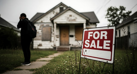 A man standing in front of a home with a For Sale sign.