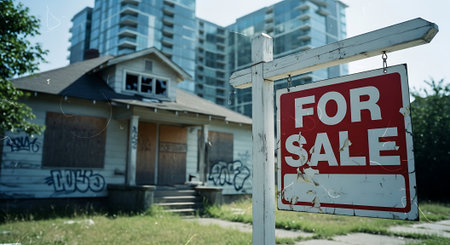 Broken windows of a building with a sign for sale on the street