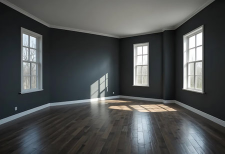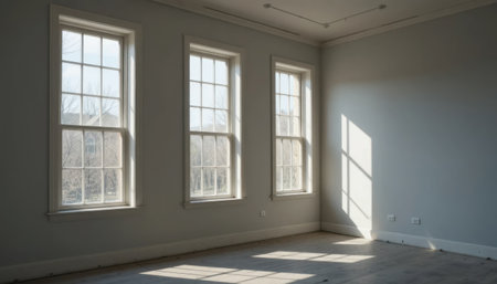 An empty room showcasing bright natural light streaming through elegant windows, revealing a warm wooden floor and classic design elements, perfect for new beginnings.