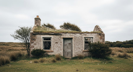 A solitary, ruined stone cottage stands weathered and abandoned in a vast, open landscape. The structure's roof is heavily overgrown with thick green grass and vegetation, blending it with the surrounding environment. The stone walls show signs of age and decay, with a crumbling section on the right. The windows are dark and empty, and the wooden door appears aged and worn. The scene is set against a muted, overcast sky, emphasizing the isolation and melancholic atmosphere of the forgotten...
