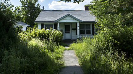A small, simple house is partially hidden by tall, uncut grass growing alongside the concrete walkway. Lush greenery and overgrown bushes flank the home, giving it a secluded feel.