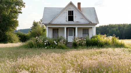 Rural landscape with a simple house and cloudy sky. Isolated farmhouse in field. Minimalist architecture in nature.