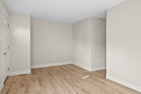 Empty room with whitewashed floating laminate flooring and newly painted white wall in background