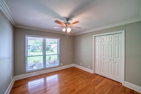 Horizontal shot of wood floors in an unfurnished bedroom.