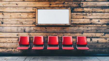 Empty red seats at a bus stop, framed by a wooden wall and a blank sign ready for advertising