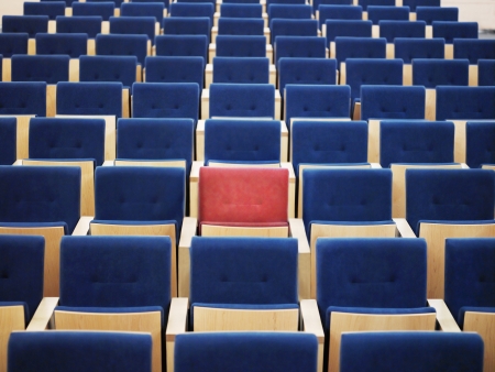 Rows of empty blue seats fill an auditorium, with a single red seat prominently positioned in the center. The seats are upholstered and have black armrests and bases. The background shows more rows of blue seats receding into the distance, and the upper levels of the auditorium with additional seating. The lighting is dim, highlighting the contrast between the red and blue seats.