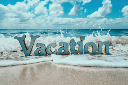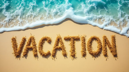 Soft golden sand holds the word vacation crafted from small pebbles and seaweed, with gentle ocean waves lapping nearby under bright sunshine.