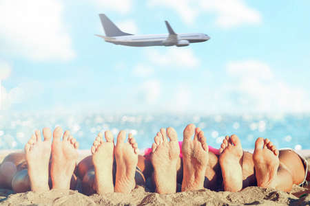 Group of friends having fun on the beach with their foots. Concept of summertime.