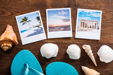 High Angle View Of A Beach Vacation Photos And Beach Accessories On Wooden Desk