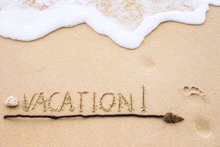 Inscription of Vacation written on wet yellow beach sand with footprint and arrow showing the direction