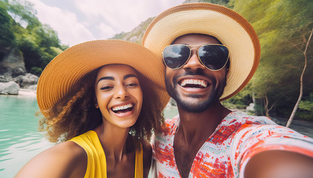 Couple travel and take a selfie on vacation.