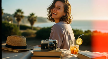 Beautiful Young Woman at the Beach with Vintage Camera