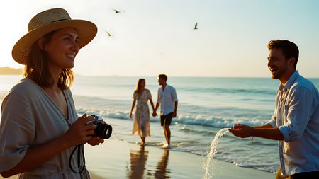Happy young couple taking photos of their friends on the beach at sunset