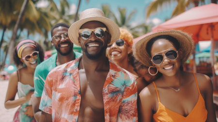 Friends enjoying a sunny day at the beachside promenade with palm trees and a vibrant atmosphere during summer