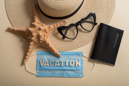 Top view on hat sunglasses passport starfish and mask with inscription Vacation. Travel concept during the spread of coronavirus